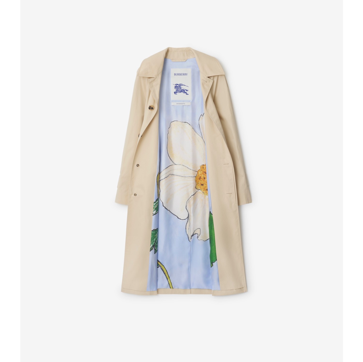 - A fresh expression of the Burberry car coat, created in partnership with Highgrove Gardens, which surround the private residence of Their Majesties King Charles III and Queen Camilla. A celebration of British craft, the design is made in Yorkshire from lightweight cotton gabardine with a silk twill lining featuring artwork by London-based artist Helen Bullock. The print is inspired by the role bees play in the ecosystem of the gardens at Highgrove. Tailored to a regular fit with raglan sleeves.